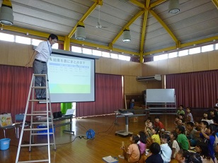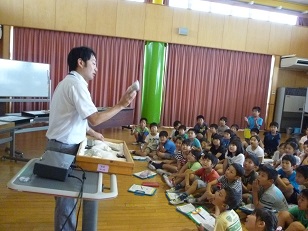 埼玉県立自然史博物館から2年前に本校にいらした東先生を講師に迎え、たねについてのお話と自由研究の取り組み方についてのお話を聞きました。たねの勉強では、たねの種類や役割、仕組みなど、子どもたちは東先生の問いかけに答えながらお話を聞いていました。