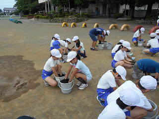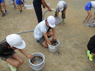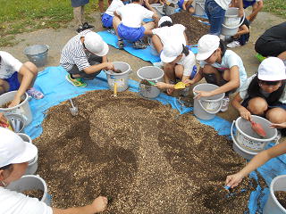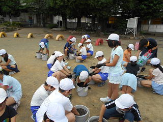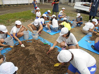 子どもたちは、土の感触を楽しんだり、ちょっぴり怖がったりしながら頑張っていました。