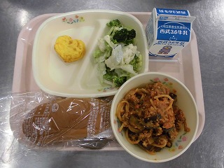 〈献立名〉牛乳、黒パン、FUKAYAなすの和風ボロネーゼ、オムレツ、花野菜のサラダ