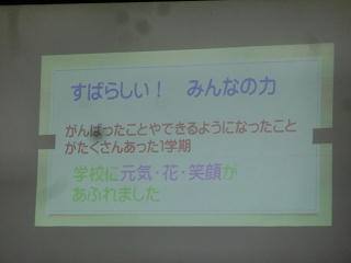 各教室では、一人一人に担任の先生から「あゆみ」が手渡されました。ご家庭でじっくりお読みになり、「頑張ったところ」「よくできたところ」を褒めていただきたいと思います。小さな「できた」の積み重ねが、お子様の成長につながります。お家の方の「よくがんばったね。」という一言が「認めてもらえた。」との自己有用感や次への「やる気」につながります。ぜひお願いします。