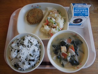 〈献立名〉牛乳、わかめごはん、メンチカツ、ポテトサラダ、大根の味噌汁