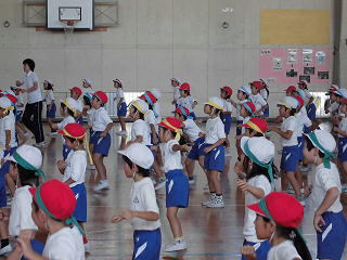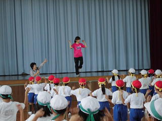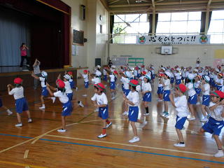 運動会のダンス「ニンジャリバンバン」の練習を始めました。2年生は1年生と一緒に演技します。