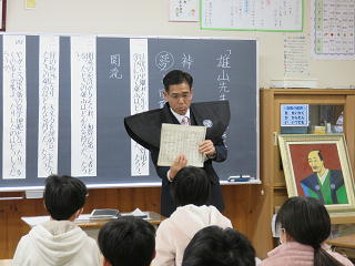 授業では、学問に励む雄山の気持ちなどについて、子ども達に考えさせました。人生には、夢(こころざし)が必要であること、それを実現するためには困難に立ち向かう勇気や粘り強さも必要であること、そして、困難に出会ったときには、周りの人が支えてくれるということなどを、雄山の生き方から感じとったようでした。