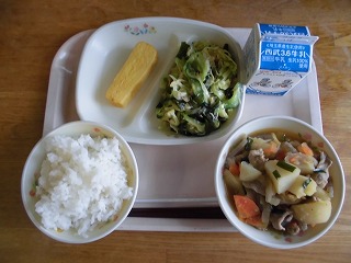 〈献立名〉牛乳、白飯、厚焼き玉子、じゃが豚キムチ、和風サラダ