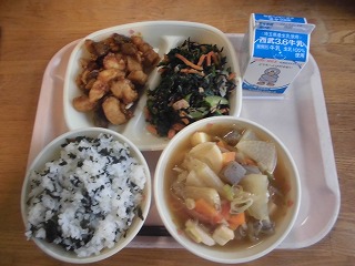 〈献立名〉牛乳、わかめごはん、鶏肉とレバーのレモン煮、ほうれん草とひじきのサラダ、けんちん汁