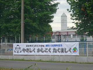 開校130周年を記念して、横断幕を作成しました。学校教育目標の「やさしく かしこく たくましく」をメインに、校章ときったちゃんがデザインされています。なかなか良いものができたなと思っています。正門横のフェンスに掲げましたので、お近くを通行の際には、ぜひご覧ください。