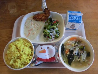 〈献立名〉牛乳、カレーピラフドリア風(ドライカレー)、フライドチキン、クリスマスサラダ、野菜コンソメスープ、ケーキ(いちごのモンブラン)