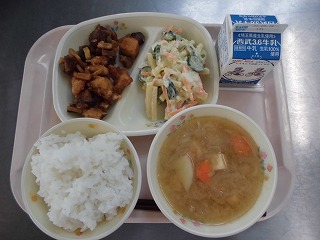 〈献立名〉牛乳、ごはん、鶏肉と高野豆腐の甘辛だれ、マカロニサラダ、玉ねぎとじゃが芋の味噌汁