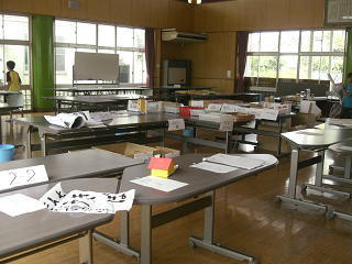 多目的ホールにクラスごとにテーブルが用意してあります。