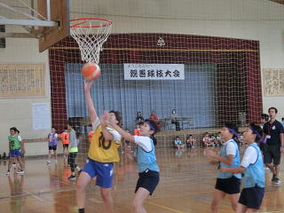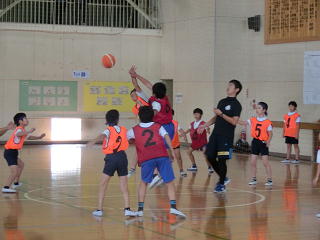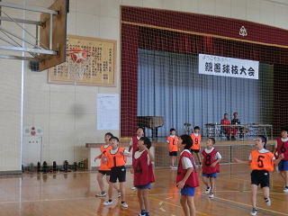 今日、本校の体育館を会場に、5年生の親善球技大会(バスケットボール)が行われ、川本南小と本校の5年生児童がそれぞれ勝利をめざして競い合いました。