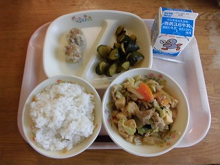 〈献立名〉牛乳、ごはん、蒸しシュウマイ、胡瓜のピリッと漬け、生揚げのチャオサイ