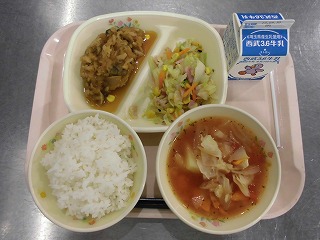 〈献立名〉牛乳、ごはん、和風おろしハンバーグ(きのこいり)、キャベツのペペロンチーノふう、野菜スープ