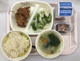 カレーピラフドリア風・フライドチキン・温野菜ドレッシング・豆腐と野菜のコンソメスープ・ケーキ・牛乳