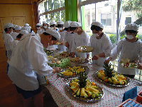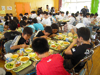 バイキング給食当日。豪華なごちそうが目の前に並び、みんな少々興奮気味。すべてのおかずをお皿に盛りたいところを我慢して、昨日の献立を確認しながらバランスよくいただくことができました。心を込めて用意していただいた料理を、飾り用のレタスまで残らず食べることができました。結果、一食分のカロリーを超えてしまった子もいたようですが、みんなでおいしく楽しくいただくことができました。