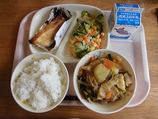 〈献立名〉牛乳、白飯、カンパチの味噌マヨネーズ焼き、たくあんサラダ、じゃが豚キムチ