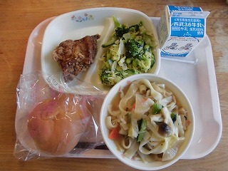 〈献立名〉牛乳、フラワーロール、麴唐揚げ、ふっかちゃん野菜のごまごまサラダ、煮ぼうとう