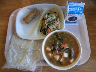 〈献立名〉牛乳、マーボーラーメン(ホット中華麵)、春巻き、深谷ねぎのナムル