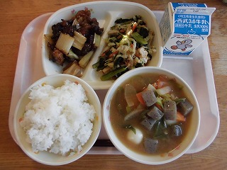 〈献立名〉牛乳、白飯、ふっかちゃんの絆やきとり、煮びたし、重忠汁