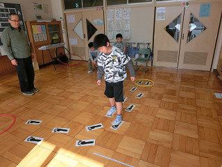 八木先生には、足跡シートにそって歩くゲームを最初にして