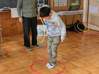 腰の所で回す使い方ではなく、両足でフラフープをはじきながら