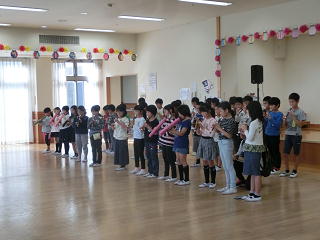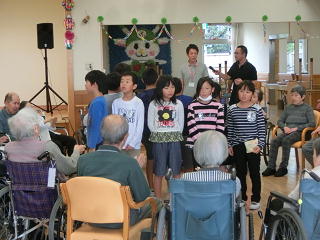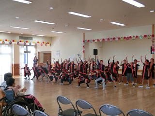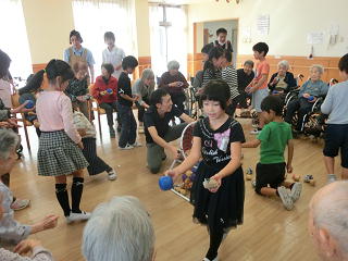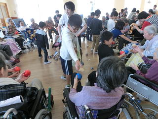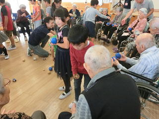 施設の方々に温かく迎えられたあと、歌とリコーダーの演奏、そして運動会で覚えたソーラン節を披露しました。そのあとは、施設の方々と「玉入れ」を楽しみ、最後はみんなで「ふるさと」を歌いました。