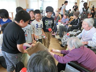 お年寄りの方とにこにこ会話をしている児童がいたりして、和やかなひとときとなりました。