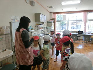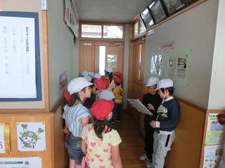 今日の2校時に、1・2年生が生活科の学習で「学校探検」をしました。職員室や保健室、体育館といった特別教室の前で、2年生が1年生に、「ここは、○○室です。・・・するところです。」と、説明していました。