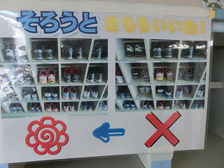靴そろえができている児童の靴箱に、校長先生が「花まる」マークを付けてくださっています。よく観察してみると、外履きだけでなく、上履きもきちんとそろっている児童がいて、すばらしいです。みんなの靴箱に「花まる」マークがつくといいですね。