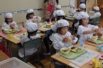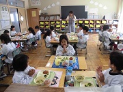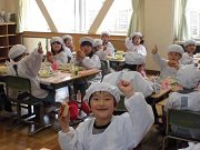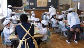1年生、初めての給食です! 6年生に手伝ってもらったり、 職員室の先生方に教わったりして おいしくいただきました。