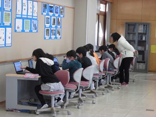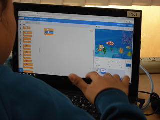 昨日と今日、4年生の2クラスが「プログラミングの授業」を行いました。「スクラッチ」というソフトを使い、画面上のキャラクターに「プログラミング」しながらいろいろな動きをさせる指示を入力し、ひとつの画面を完成させようという授業でした。
