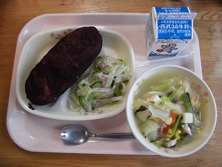 〈献立名〉牛乳、ココア揚げパン、ハムと大根のサラダ、豆腐と野菜のコンソメスープ