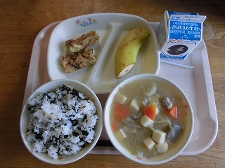 〈献立名〉牛乳、わかめ御飯、竹輪の石垣揚げ、豚汁、バナナ