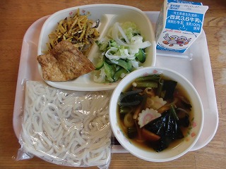 〈献立名〉牛乳、きつねうどん(地粉うどん)、小魚入り松葉芋、グリーンサラダ
