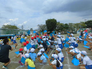 蜜にならない競技を考え実施した大玉運びでは、子どもたちが声を合わせて障害物を越えたり、一生懸命応援する姿が見られました。