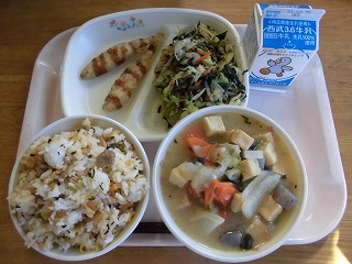 〈献立名〉牛乳、キムタクごはん(白飯)、わかさぎフライ、磯の香和え、野菜椀