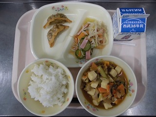 〈献立名〉牛乳、ごはん、揚げギョウザ、もやしのナムル、韓国風肉豆腐