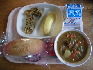 〈献立名〉牛乳、ソフトフランスパン、いちごジャム、カレーシチュー、ちくわの磯辺揚げ、バナナ