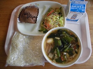 〈献立名〉牛乳、広東麵(ホット中華麵)、チョコバナナパンケーキ、春雨サラダ