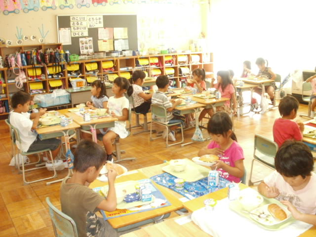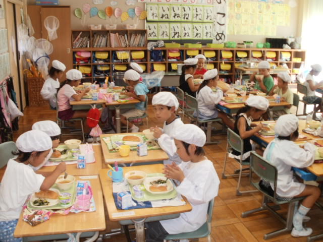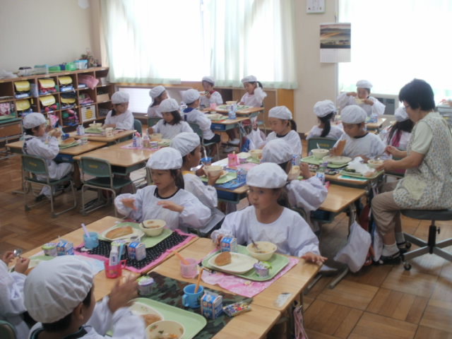 今月からエアコンが入り、とても涼しく、快適な環境の中で給食を、よりおいしく食べることができます。1年生も、入学から半年が過ぎ、給食の配膳も片付けも、とても上手になってきました。※毎日の給食のメニューは、「給食の紹介」のページをご覧下さい。