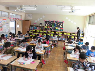 学校探検を行いました。学習したひらがなを学校の中で見つけていろいろな教室を探しました。隠れているひらがなをつなぎ合わせるとある言葉ができます。目をキラキラさせてがんばっていました。