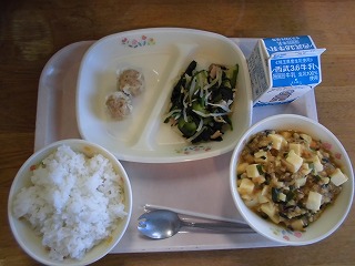 〈献立名〉牛乳、白飯、麻婆豆腐、蒸しシュウマイ、もやしのナムル