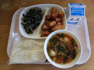〈献立名〉牛乳、広東麵(ホット中華麵)、みそポテト、ほうれんそうとひじきのサラダ