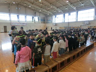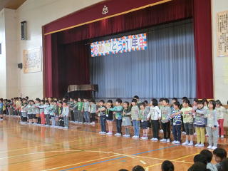 今日の業間休みに、1年生を迎える会を行いました。2年生がペンダントを、3・4年生が歌を、5・6年生が会場の準備で1年生を温かく迎えました。1年生は、大きな声で「さんぽ」を歌い、「よろしくお願いします!」と元気にあいさつすることができました。全校428名みんなで、すばらしい川本北小学校を創っていきましょう。