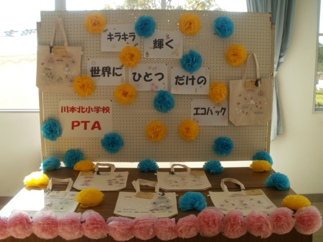 公民館の中では、北小PTA作成の「世界にひとつだけのエコバック」や南小PTA作成の「備長炭オブジェ」、藤田雄山顕彰会の展示や川本保育園・川本南保育園・若竹幼稚園の園児の作品等、多数展示されており、どれも見応えがありました。