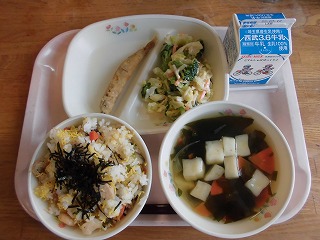 〈献立名〉牛乳、ちらし寿司(酢飯)、ししゃもフリッター、野菜のマヨじょうゆ和え、すまし汁