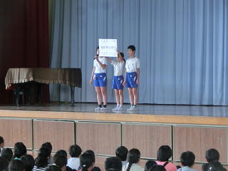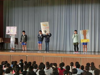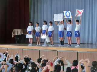 今朝は児童集会で、図書委員会の発表でした。おすすめの本の紹介をしたあと、○×クイズをしました。本校には2つの図書室がありますが、総冊数は1万冊以上になるのだそうです。