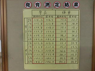 今年度の発育測定の結果が、保健室前の廊下に掲示されています。ほとんどの学年が、男女ともに県の平均値を上回っていました。(身長では約1~2㎝、体重では約1~2㎏)