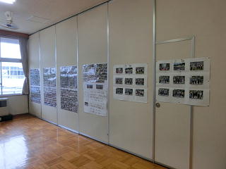 <5年林間学校、6年修学旅行の写真が展示されています>