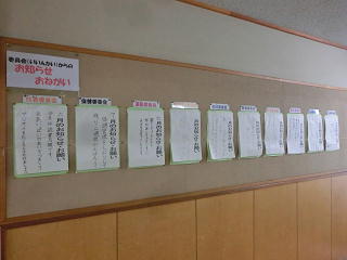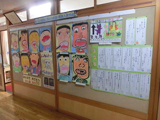 <保健室前 むし歯予防の作品が掲示されています>