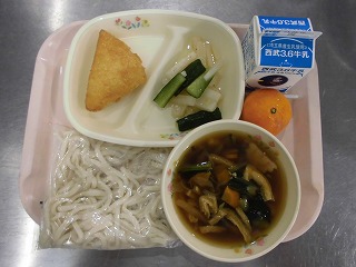 〈献立名〉牛乳、五目うどん(地粉うどん)、チーズはんぺんフライ、スティック野菜、冷凍みかん